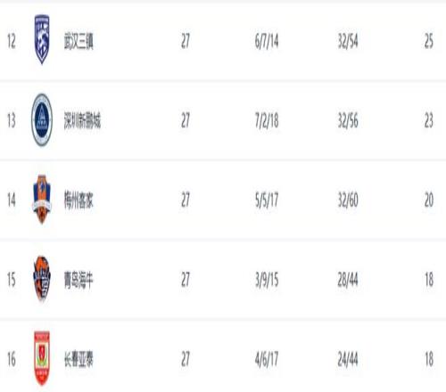 27轮之后,新鹏城以23分排名第13位,梅州客家以20分排名第14位,青岛海牛、长春亚泰同积18分。